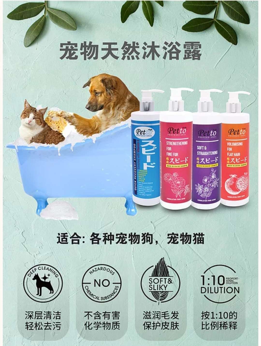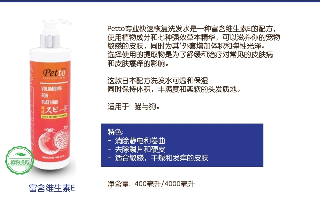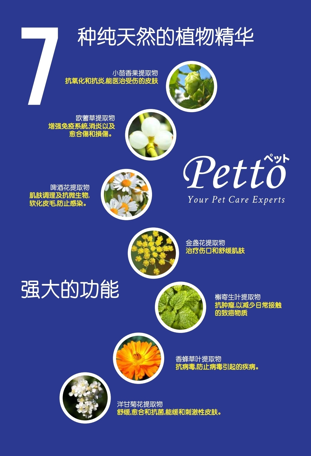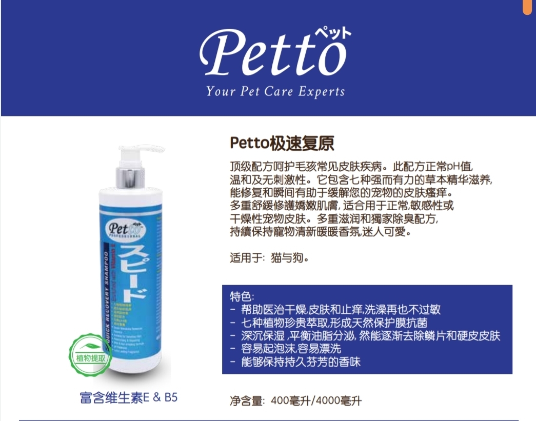 PETTO PROFESSIONAL极速复原系列 采用7种纯天然植物精华 顶级配方呵护毛孩常见皮肤疾病
