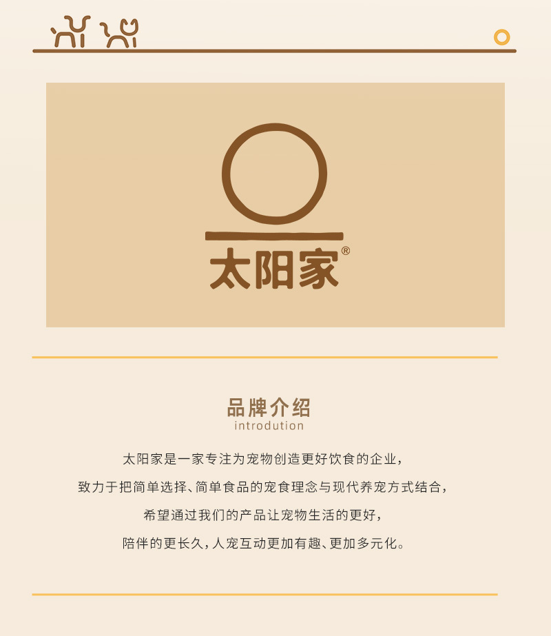 太阳家® 是一家专注于为宠物创造更好饮食的企业。 致力于将选择简单、食物简单的宠物理念与现代宠物饲养方式相结合。 它希望让宠物生活得更好,陪伴更久,通过产品给宠物。 交互更加有趣和多样化。